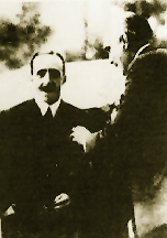 El rey Don Alfonso XIII es recibido por el político santanderino Ruano de la Sota, presidente de Honor de la Asociación de la Prensa cántabra e impulsor de la constitución de la Federación Asociaciones de la Prensa de España, hecho que tuvo lugar en Santander en 1922 |