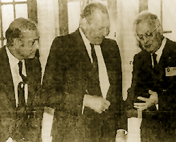 Luis Apostúa (derecha), presidente de la FAPE en 1984, hace entrega en Santander de una placa conmemorativa a don Juan de Borbón en presencia del entonces alcalde Juan Hormaechea |