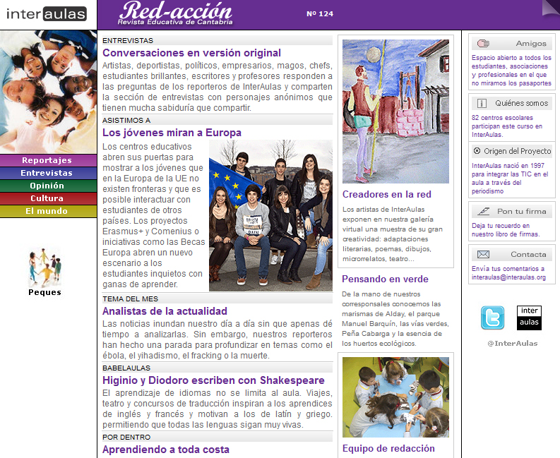 Los reportajes, entrevistas, noticias y opiniones de los escolares de Cantabria publicados en ‘Red-acción’ durante el pasado curso 2014/2015 pueden leerse en el nuevo número de la revista digital intercentros del Proyecto InterAulas. Artistas como José Ramón Sánchez, deportistas como Ruth Beitia, escritores como Benjamín Prado o políticos como Iñigo dela Sernapasaron por los micrófonos de los aprendices de periodista, que también mostraron su centro escolar “por dentro” y contaron las salidas didácticas, las actividades medioambientales y las experiencias solidarias.