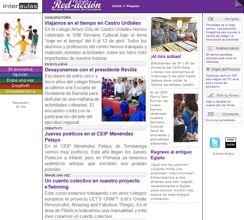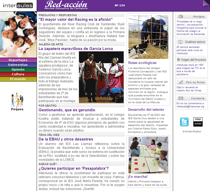 La revista ‘Red-acción’ forma parte de InterAulas, un proyecto educativo y periodístico que nació en diciembre de 1997 fruto del convenio de colaboración entre la Asociación de la Prensa de Cantabria y la Consejería de Educación. Puedes leer el número 134 de la revista digital escolar intercentros en esta dirección: http://www.interaulas.org