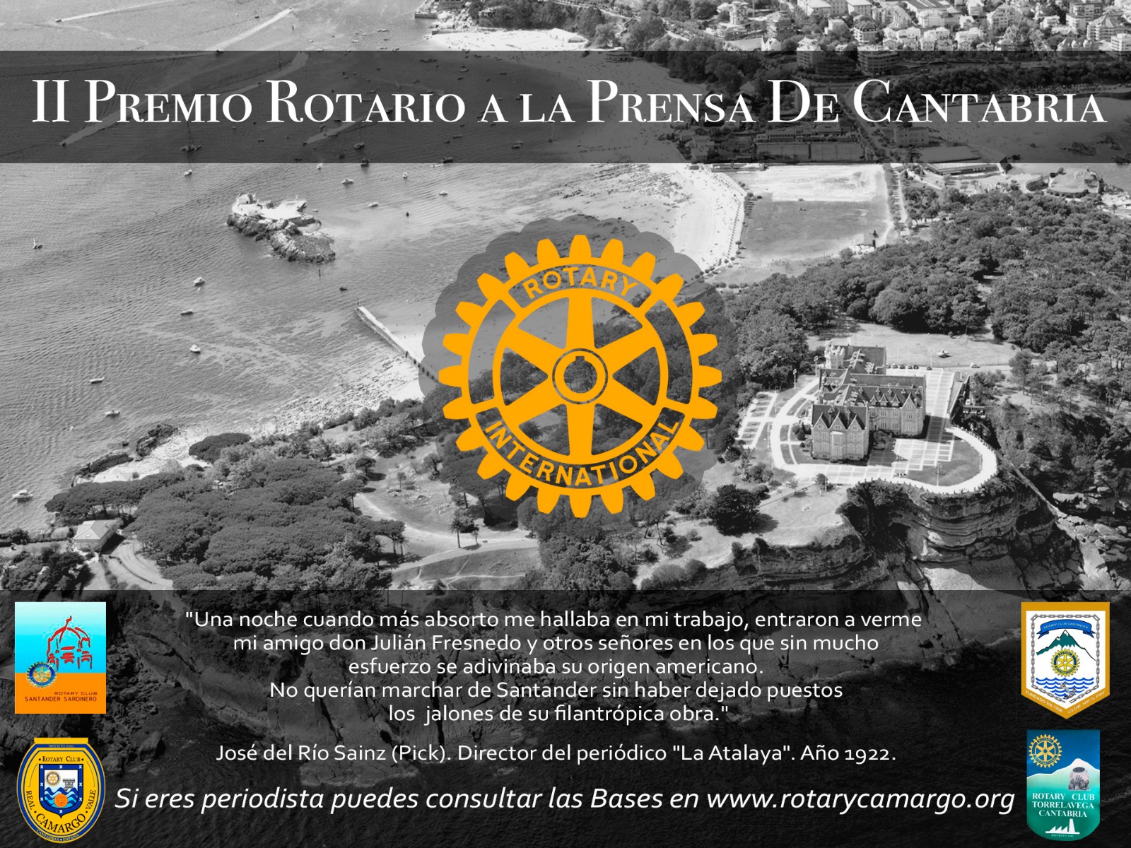 Los Clubs Rotarios de Cantabria –Santander, Torrelavega, Camargo y Santander-Sardinero-, en colaboración con la Asociación de Periodistas de Cantabria, han convocado el II Premio Rotario a la Prensa de Cantabria que se concederá al profesional de prensa, fotoperiodista, radio o televisión en cuya actividad destaquen los valores rotarios: solidaridad, altruismo, búsqueda de la cultura y el conocimiento, promoción de la ética profesional o el fomento de la paz en el mundo. El premio consistente en la concesión de la insignia ‘Paul Harris Fellow’, la máxima distinción rotaria, se entregará el 7 de junio en un acto en el Palacio de la Magdalena de Santander.