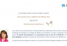 La Asociación de Periodistas de Cantabria y el Colegio de Médicos de Cantabria hemos organizado una charla online con motivo del Día Mundial de la Libertad de Prensa. Teresa Pérez Alfageme, periodista y asesora de comunicación nos hablará sobre El desafío del periodismo y la comunicación ante la crisis de la COVID-19, el próximo lunes día 3 de mayo a partir de las 18.00 horas.