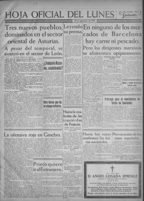 En el Santander republicano de 1935, los vendedores de prensa anunciaron a viva voz la salida a la calle de ‘La Hoja del Lunes’. El Gobierno había decidido que los periodistas y trabajadores de los talleres tenían derecho a descansar un día a la semana. Y se eligió el lunes. Por eso, se acordó que fueran las asociaciones de la prensa las que editasen los periódicos ese día. En Santander, el primer número se vendió el 22 de abril de 1935, aunque los primeros ejemplares se perdieron durante la guerra y otros se conservan copias en la sede de la Asociación de Periodistas de Cantabria.