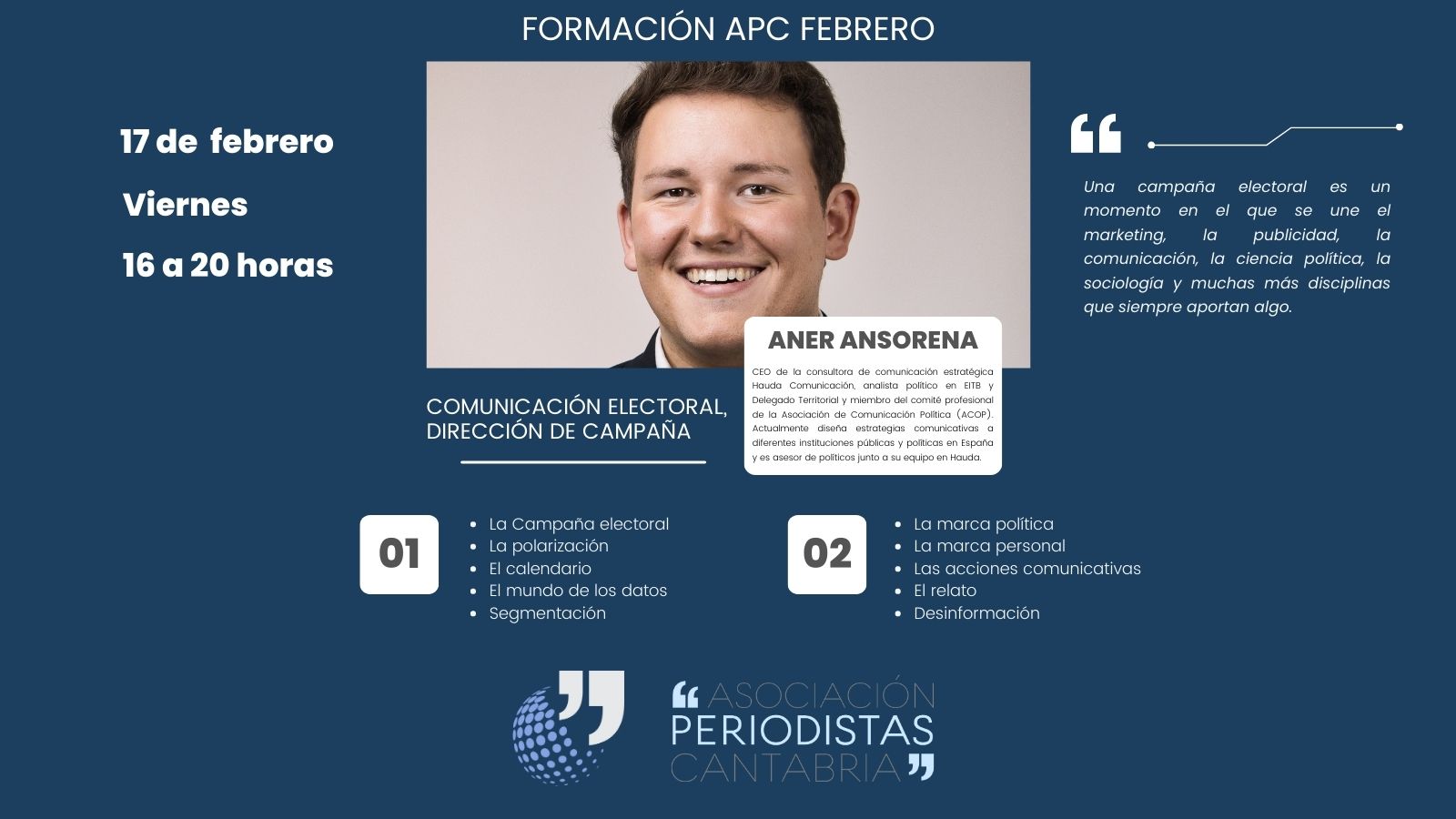 Es por ello que la APC ha organizado este taller sobre comunicación electoral y dirección de campaña que se desarrollará el viernes, 17 de febrero, de 16.00 a 20.00 horas en el Hotel Santemar.