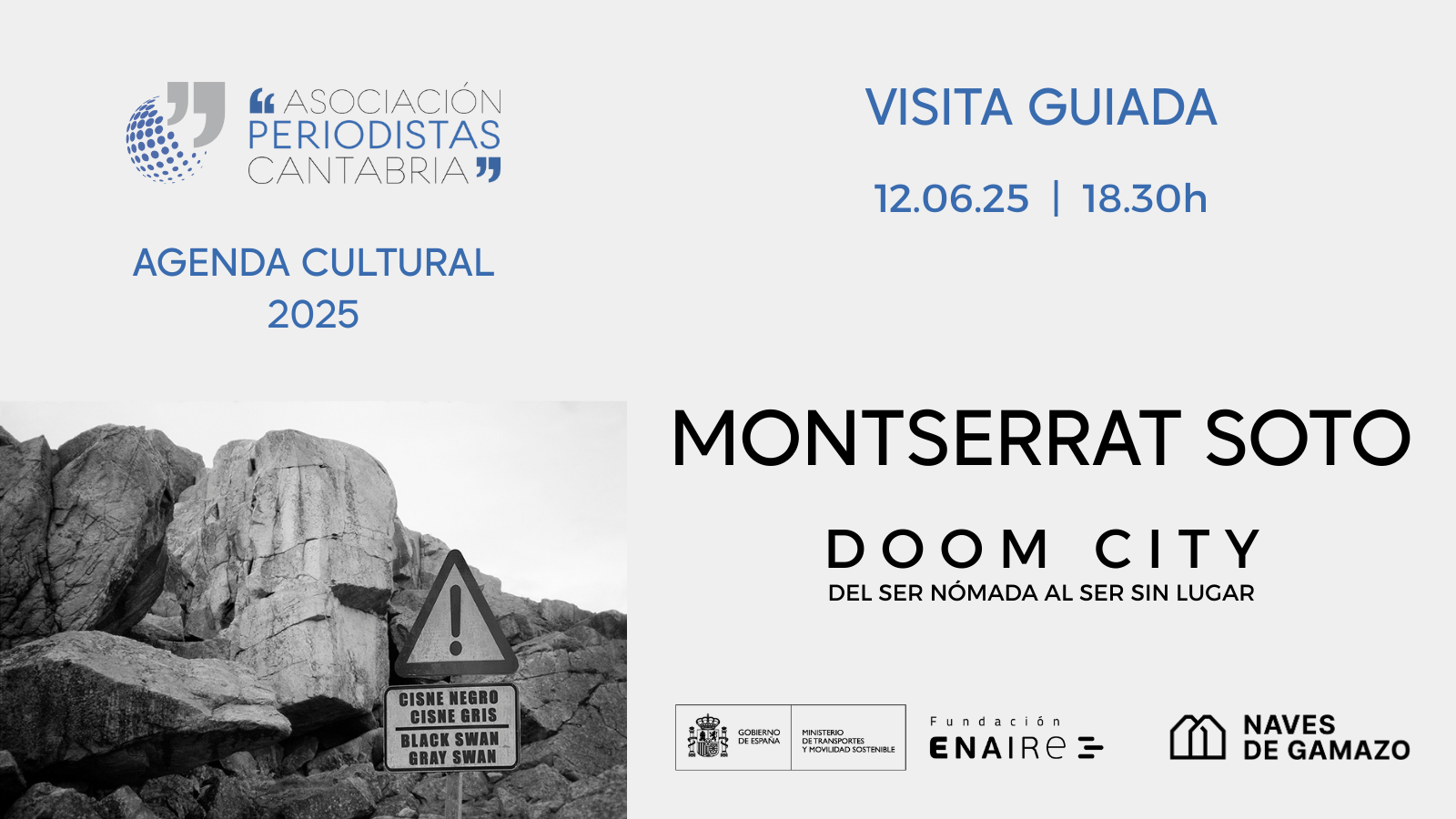 El Centro de Arte Naves de Gamazo acoge la exposición temporal Doom City. Del Ser nómada al Ser sin lugar de la artista Montserrat Soto. En este año 2025, iniciamos colaboración entre la APC y la Fundación ENAIRE para ofreceros visitas guiadas a todas las muestras que formen parte de su programación. Estas visitas tienen una duración aproximada de 50 minutos y están dirigidas por un equipo de mediación cultural especializado que facilita la conexión del público y el disfrute del contenido cultural.