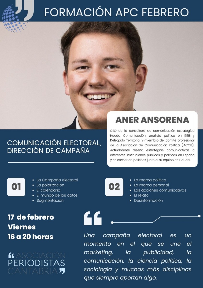 Contaremos con Aner Ansorena. CEO de la consultora de comunicación estratégica Hauda Comunicación, analista político en EITB y Delegado Territorial y miembro del comité profesional de la Asociación de Comunicación Política (ACOP). Actualmente diseña estrategias comunicativas a diferentes instituciones públicas y políticas en España y es asesor de políticos junto a su equipo en Hauda.